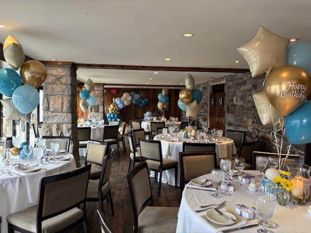 Sophisticated Double Digits balloon bouquets for for a Surprise 40th birthday party at The Black Bass Hotel in New Hope.