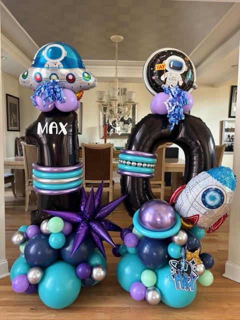 This Outer Space Double Digit Themed Number Balloon Bouquet is out of this world! $220 for the set includes delivery within 15 miles of Washington Crossing PA. ($5 per mile over the initial 15) Call or Text Bucks County Balloons at 215-801-2412 to book your birthday balloons.