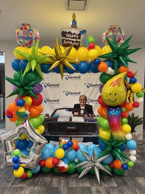 Traditional Balloon Columns with Jumbo Toppers for the boss's surprise birthday party at Gentell in Yardley. $190 for two.