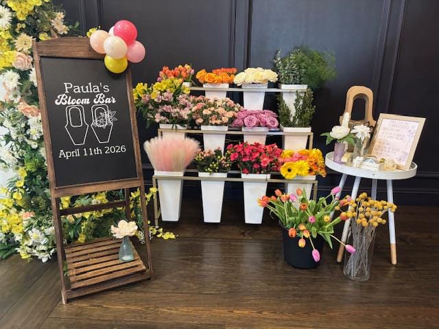 Enjoy our new Bloom Bar! Includes cart rental, delivery, a great selection of flowers and greenery- trimmed and ready, take home bouquet bags, ribbon, a customized sign and breakdown. Call or Text Jessica for pricing. 215-801-2412