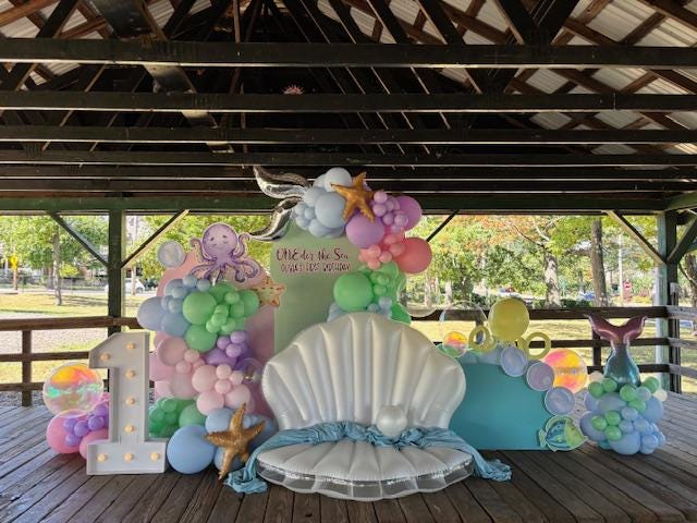 A beautiful "Oneder The Sea" theme balloon backdrop for a first birthday party at Menlo Park in Perkasie PA. Call or Text Jessica to book your balloons! 215-801-2412