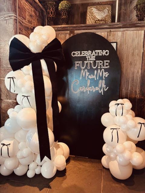This gorgeous balloon backdrop was for a magical rehearsal dinner at La Stalla in Newtown. I worked with the amazing wedding Planner Kristina Wittig on this. 6 1/2 foot by 3 1/2 foot Chiara Backdrop with Balloon Garland and Custom Lettering ($550.00) plus a Jumbo Bow Rental ($55).
