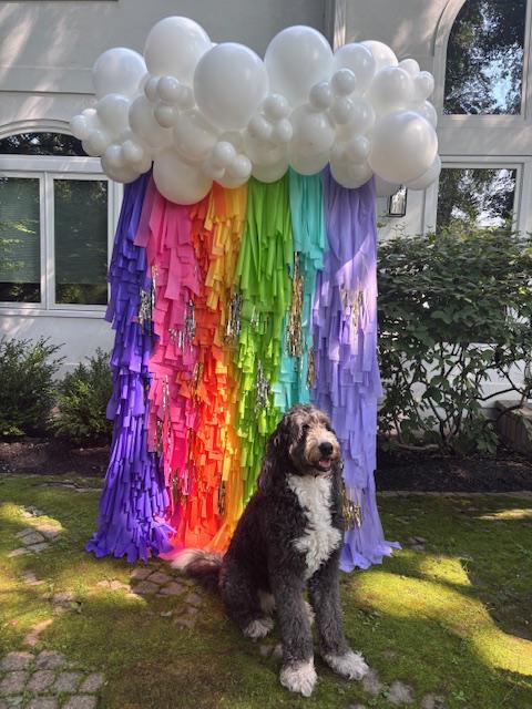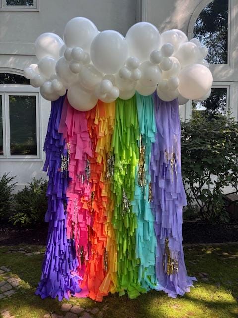 This stunning backdrop is the perfect focal point for any type of celebration. Once fully installed, stands 7 feet tall and 4 feet wide. The rental backdrop is these colors only. And the balloons can be any color(s) you like and are yours to keep at the end of the party. Call or text Jessica to book this beautiful backdrop.
