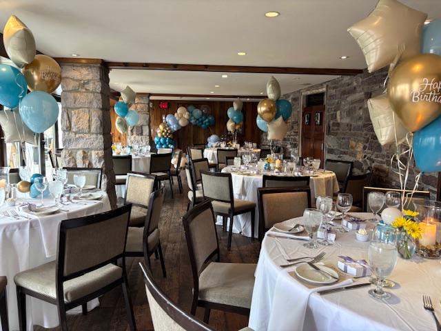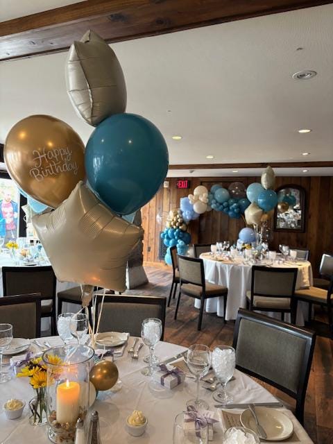 Helium Balloon Centerpieces can be created in many colors and themes. Prices vary, but for two 18" foil balloons and three 12" latex balloons as shown in blues, golds and creams it is $21.50 per centerpiece. Delivery may be additional. Call or Text Jessica to discuss options, details and dates. 215-801-2412